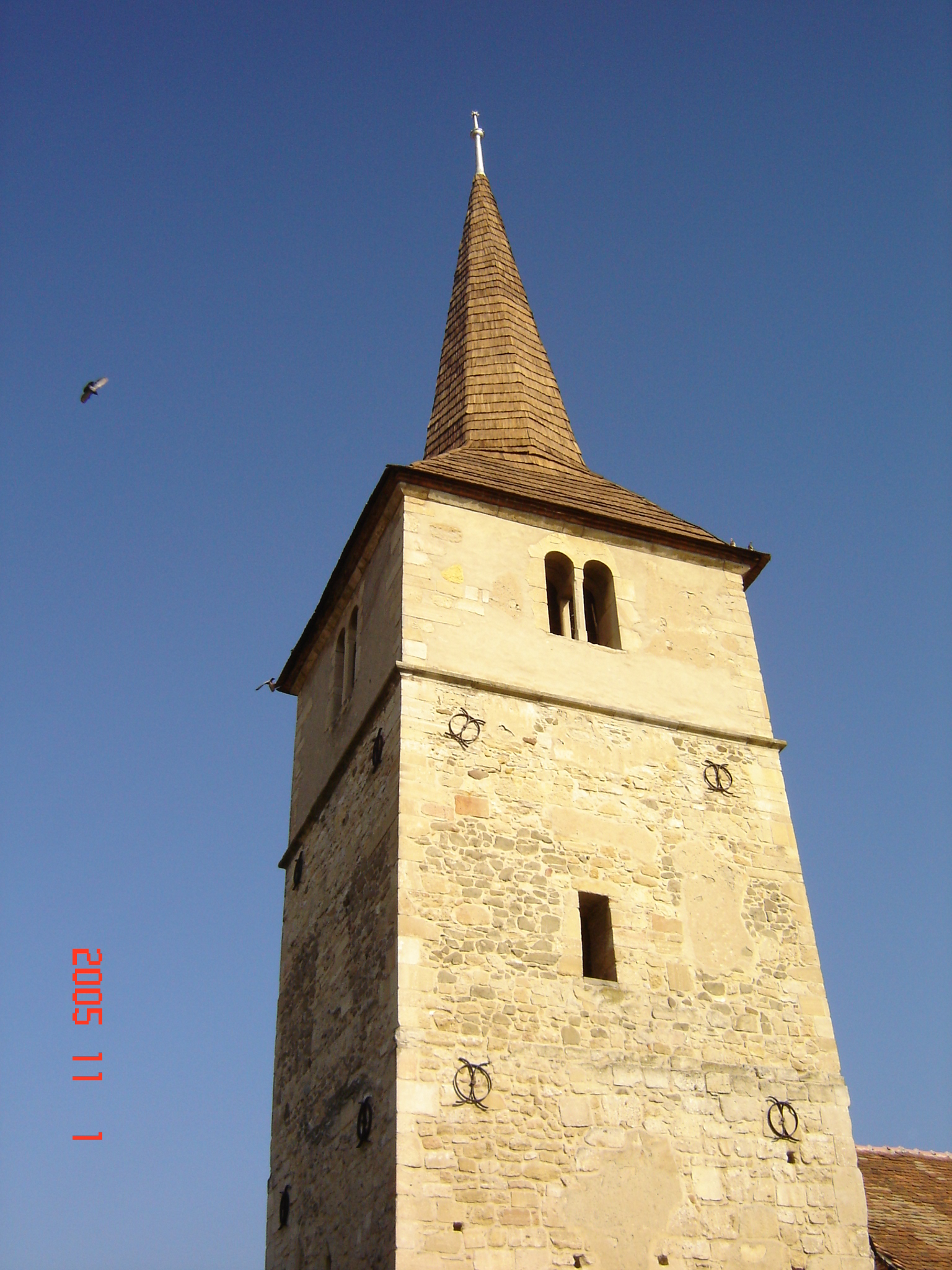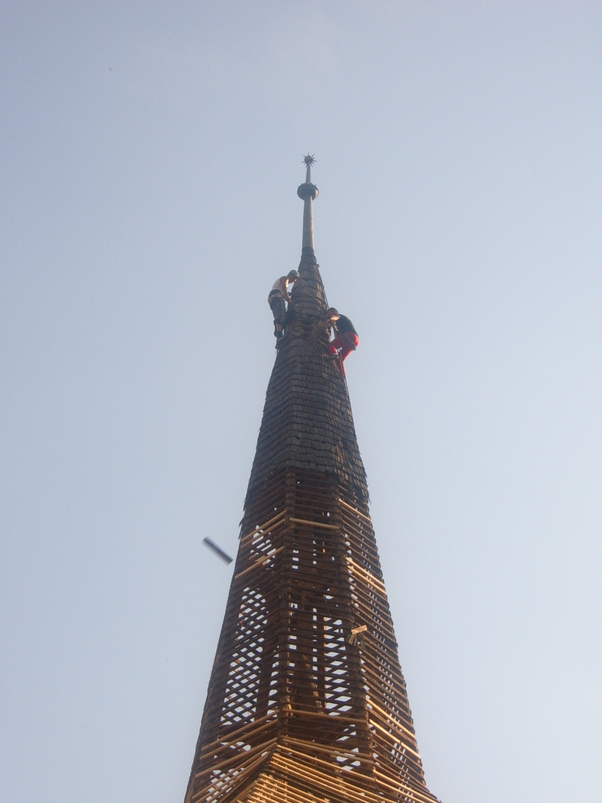 A templomtorony zsindelytetejét szakmunkásokkal cseréltettük ki, az anyagot azonban nekünk kellett beszerezni Székelyföldről. Hála Istennek idén két helyi fiatal is bekapcsolódott a munkákba, így velük is tudtunk beszélgetni.